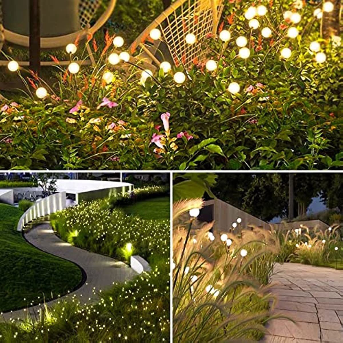 Swaying in the Wind Solar Powered Lights: The solar landscape lights have 8 larger LED bulbs and two lighting modes (warm white light constantly and flashing breathing mode). When night falls; these bright firefly lights sway with the wind and twinkle; creating an exciting and beautiful romantic atmosphere. These solar pathway lights have amazed and praised friends and neighbors.