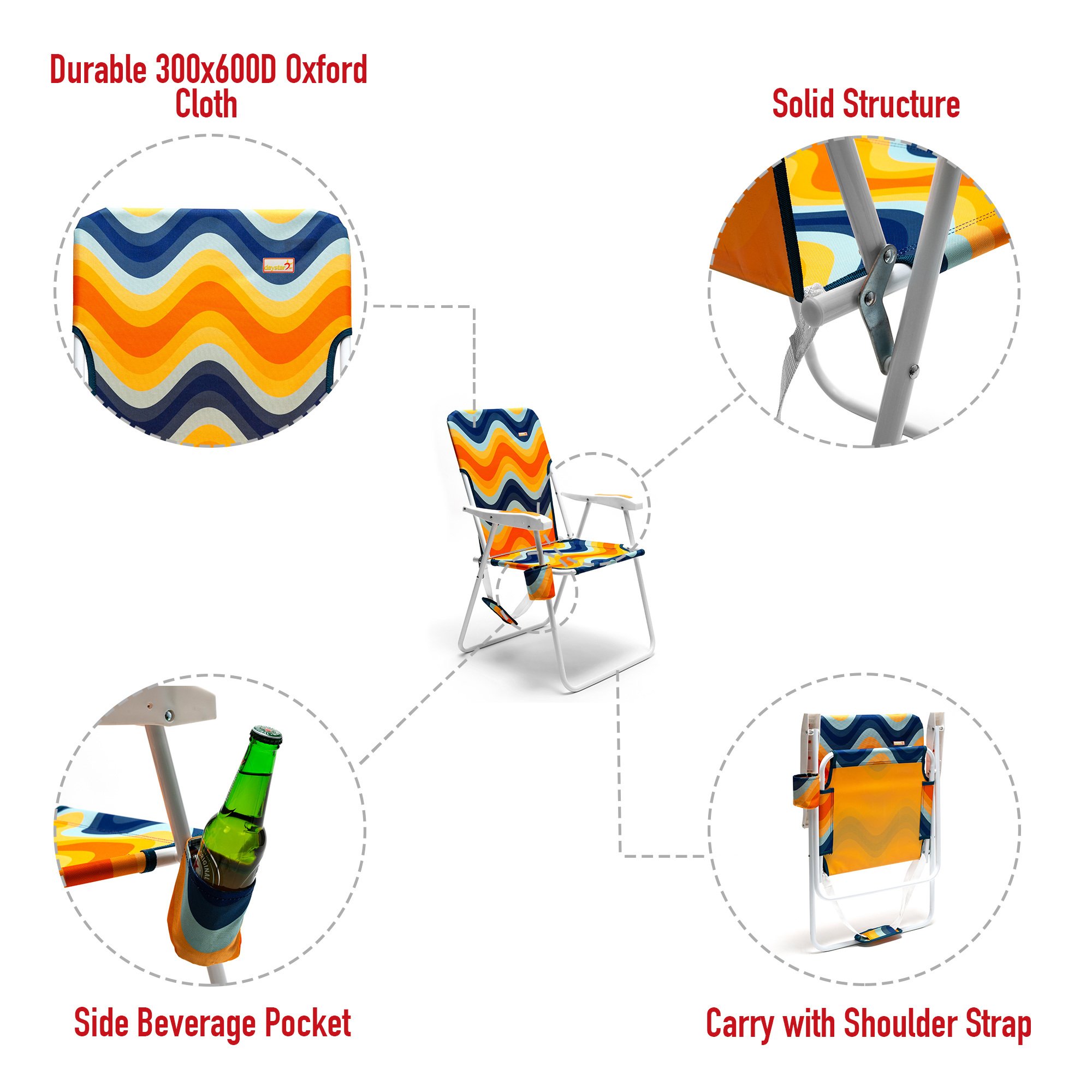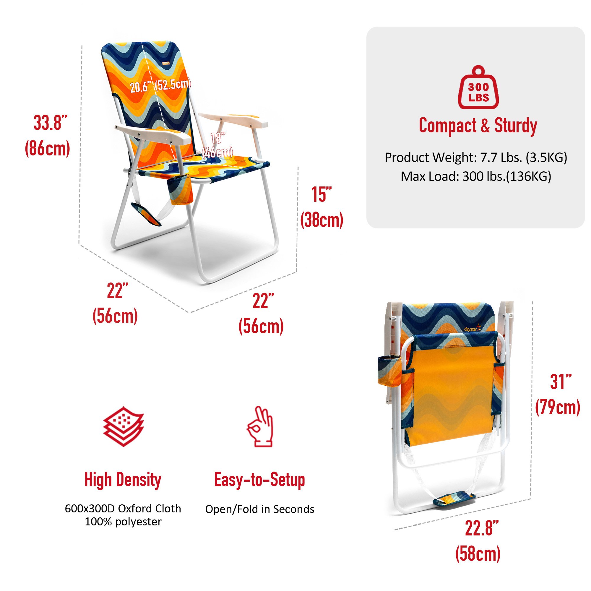 Extremely Comfy & Space Saving: The Folding Beach Chair Lightweight with High Back Beach Chair for adults provides you an ultimate comfortable seating experience. The small folding size (30.7×22×7 inches) saves your room while not on duty.Super Handy: This portable beach chair outdoor with built-in phone & cup holders free your hands while camping, hiking, traveling, or watching sporting events, and the high back beach chair design helps you to say goodbye to the weary neck, relaxing with the breeze.Built to Last: The sturdy Lightweight Steel with Powder Coating construction affords up to 300 LBS (136KG) weight capacity and the chair weighs 7.04 LBS (3.2KG). The 600x300D Oxford Cloth & 200g mesh has great strength, durability, and breathability.Easy-Peasy: Setting this high folding beach chair up is effortless and fast. You only have to pull the frame apart, and … Ta-Da! Here you go - now you can enjoy this supreme comfy chair and easily transport it to camp, lawn, concerts, and festivals.Camping Chair That is Built for Anywhere: Use it as a camping chair, folding chair, lawn chair, travel chair, beach chair and more. Suitable for outdoor adventures, tailgating, fishing, backpacking, beach, picnic, sport games, car travelling, or just put it in the backyard, cabin, balcony, patio lawn parties. The SunnyFeel camping chair is an essential to add to your camping accessories.High Back Beach Chair: 1 Position High Seat high off ground tall beach chair but don't recline. This lawn chair can not adjust the back.